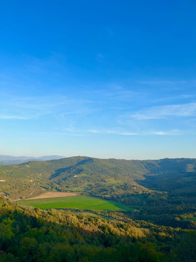 Lush, green-covered valleys and hills of Istria blending with the blue sky reveal all their massiveness and vastness. Bright green meadows stand out among the shady parts of the forest, while the hills stretch into the distance, creating a perfect contrast between nature and the blue of the sky. In this idyllic landscape, every detail tells its own story – the chirping of crickets, the rustling of leaves, and the scent of wildflowers mingling with the smell of freshly cut grass.