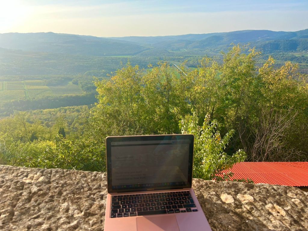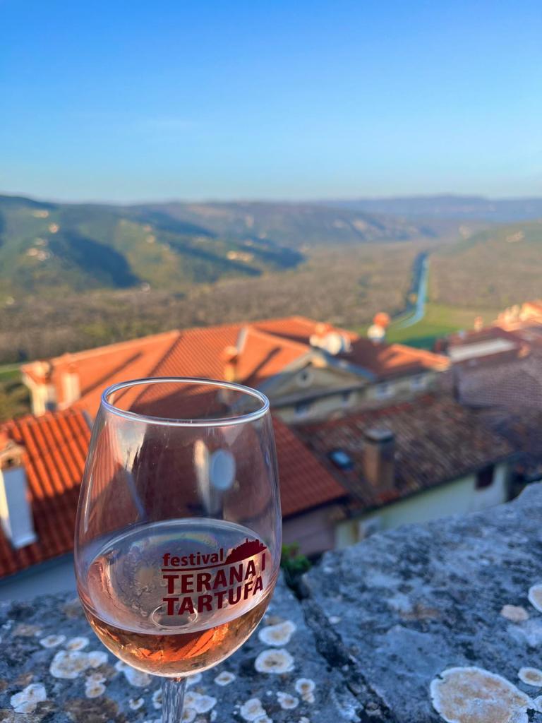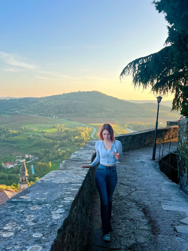 Walking through the narrow alleys, you can feel the past breathing through the stone walls, but upon reaching the town’s walls, the view captivates me, leaving me speechless every time. There’s nothing more beautiful than stopping and simply observing the landscape below you, enjoying the silence while the wind softly rustles in the background. This time, we added another little detail that completed the whole experience of enjoying the Motovun walls – a glass of homemade rosé.