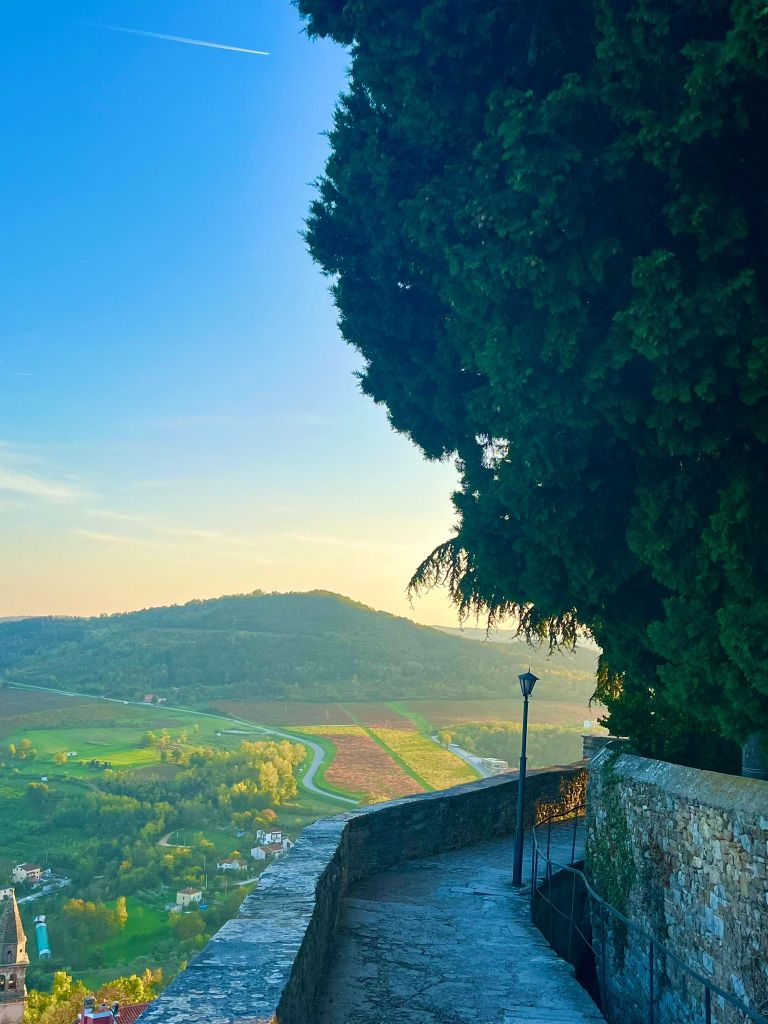 The stone walls of Motovun are illuminated by the warm sunset, while massive trees create pleasant shade along the pathway. The view from this height stretches over the hills and roads winding through the valley, as the distant horizon is bathed in golden hues of late afternoon. Below, the Mirna River flows quietly. Sunlight slowly fades, and the sky breaks into shades of orange and pink, creating a perfect conclusion to the day.