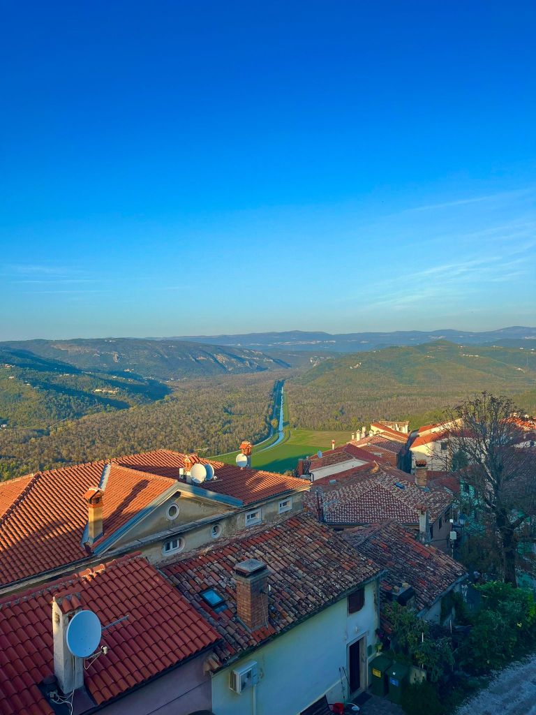 Here, watching the sunset is particularly magical, and we arrived just before sunset, admiring the colors that changed through the valleys and above them. The sky above Motovun transitions from orange to purple, creating a perfect backdrop for nature lovers and anyone wishing to capture their visit to the town with a beautiful photograph. Perhaps you, like me, will want to stay a little longer and soak in every detail – from the vineyards in the distance to the small villages.