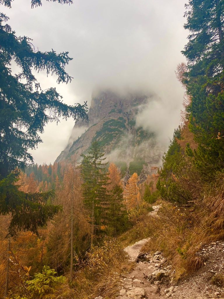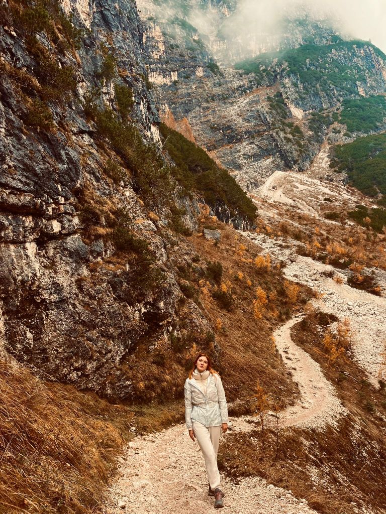 After crossing the two narrow paths along the cliffs, for me personally, the worst part followed, which was a rather long muddy trail. But keep in mind that we hiked to Sorapis in October, and most of the day it was raining. The path is definitely easier in spring or summer. Although Trail 215 is usually not officially closed during certain times of the year, in winter months, it becomes extremely dangerous due to snow, ice, and the possibility of avalanches, so it’s not recommended for hiking without proper equipment and experience in winter conditions.
